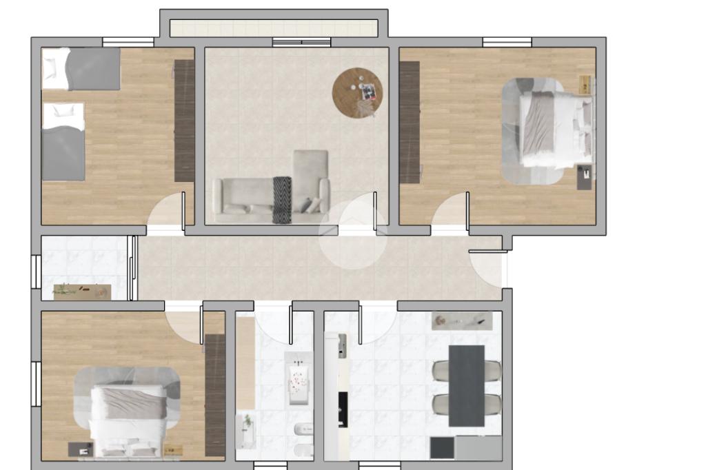 L'appartamento si compone di una cucina abitabile con soggiorno separato ed accesso al ampio balcone, tre camere matrimoniali, bagno con vasca e doccia ed infine un pratico ripostiglio.